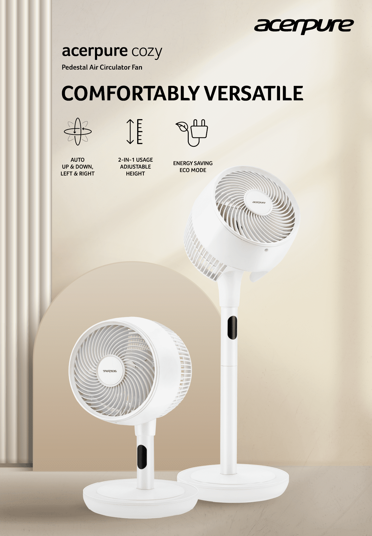 With its multi-directional spiral swing, Acerpure Cozy evenly distributes airflow. It features an up-and-