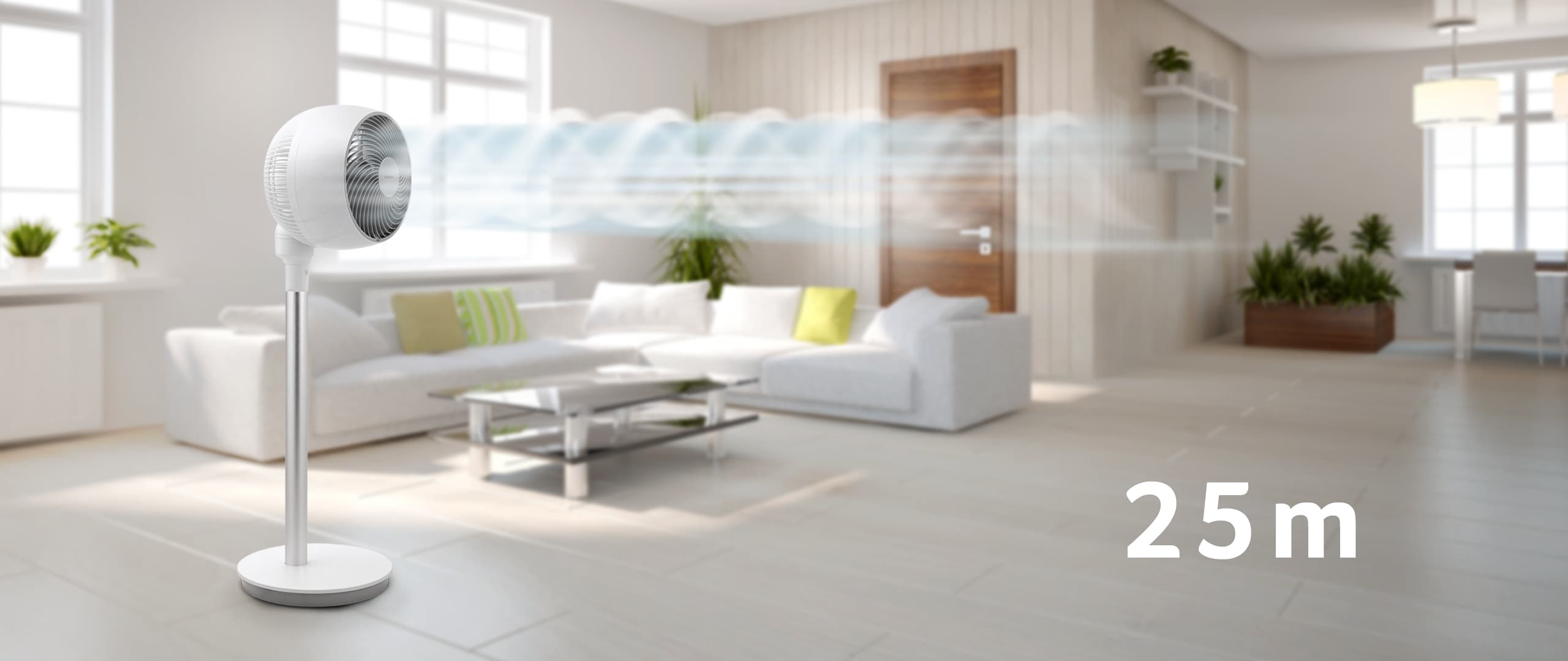 L'Acerpure Cosy projette l'air jusqu'à 25 mètres de distance, couvrant plus de 108m². Capable de faire circuler complètement l'air cinq fois par heure, il atteint tous les coins de votre maison pour offrir un maximum de confort.1