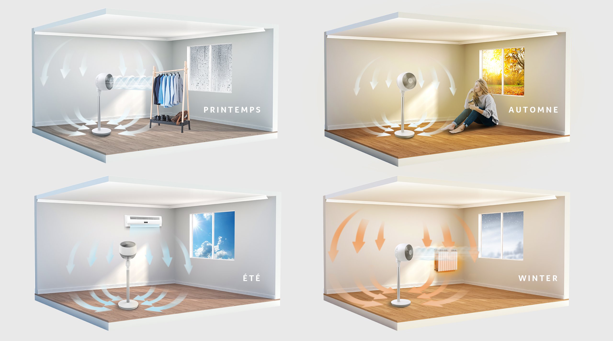 Les pales du ventilateur créent un flux d'air concentré et à plus grande portée qu'un ventilateur standard, accélérant ainsi la circulation de l'air intérieur.