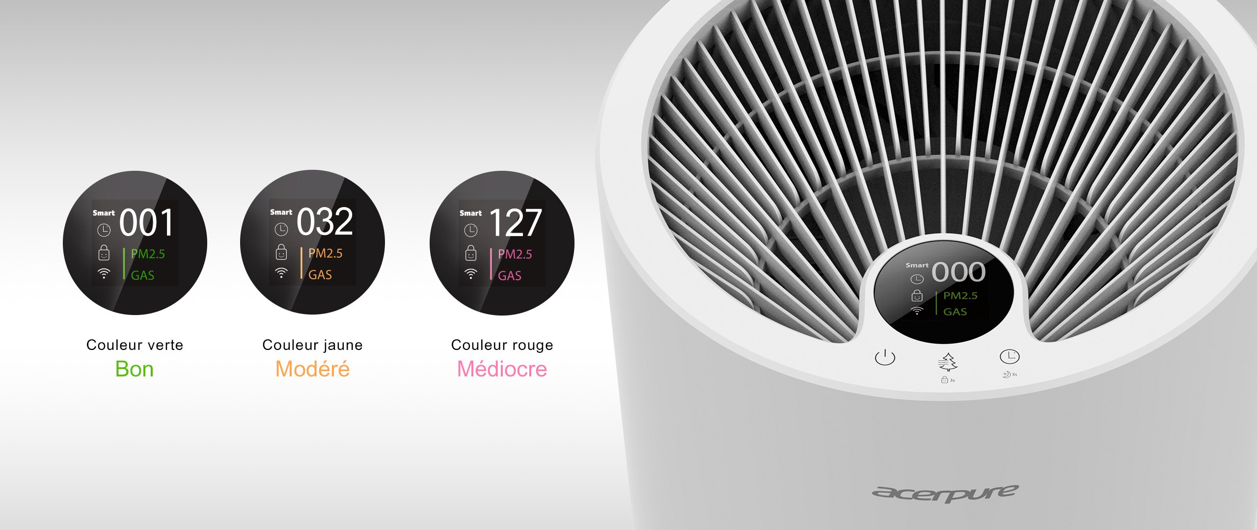 Écran LCD Indicateur de qualité de l’air/Indicateur de gaz (VOC)/Valeur numérique PM1,0 et PM2,5/Indicateur de nettoyage du filtre