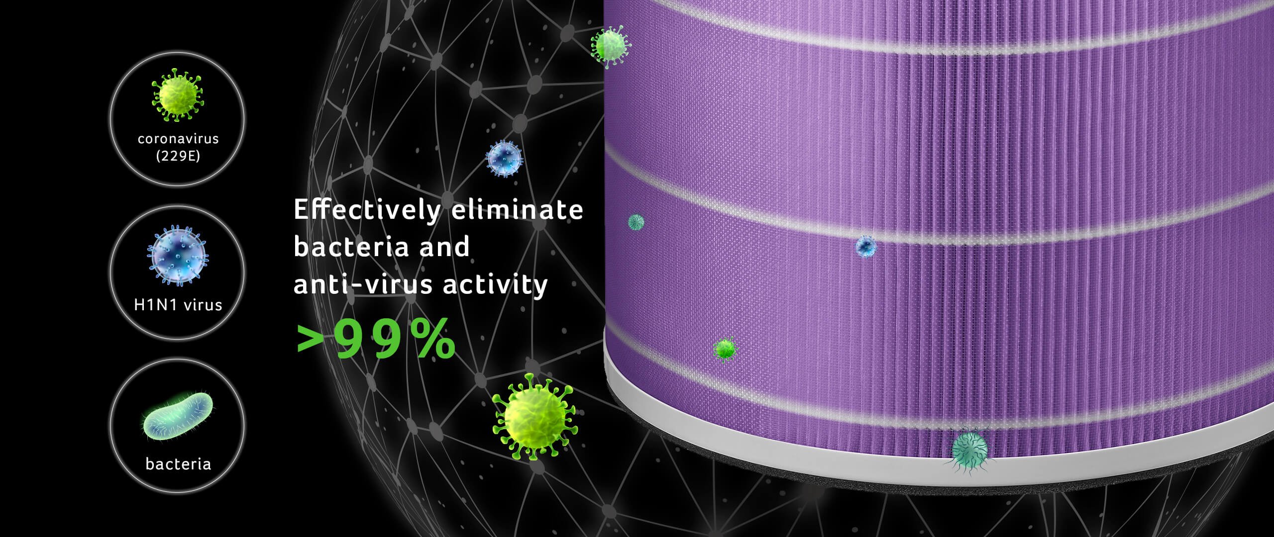Elimina de forma efectiva un 99.99% de bacterias, y en un 99% la actividad del coronavirus (229E) y el virus de la gripe A (H1N1).