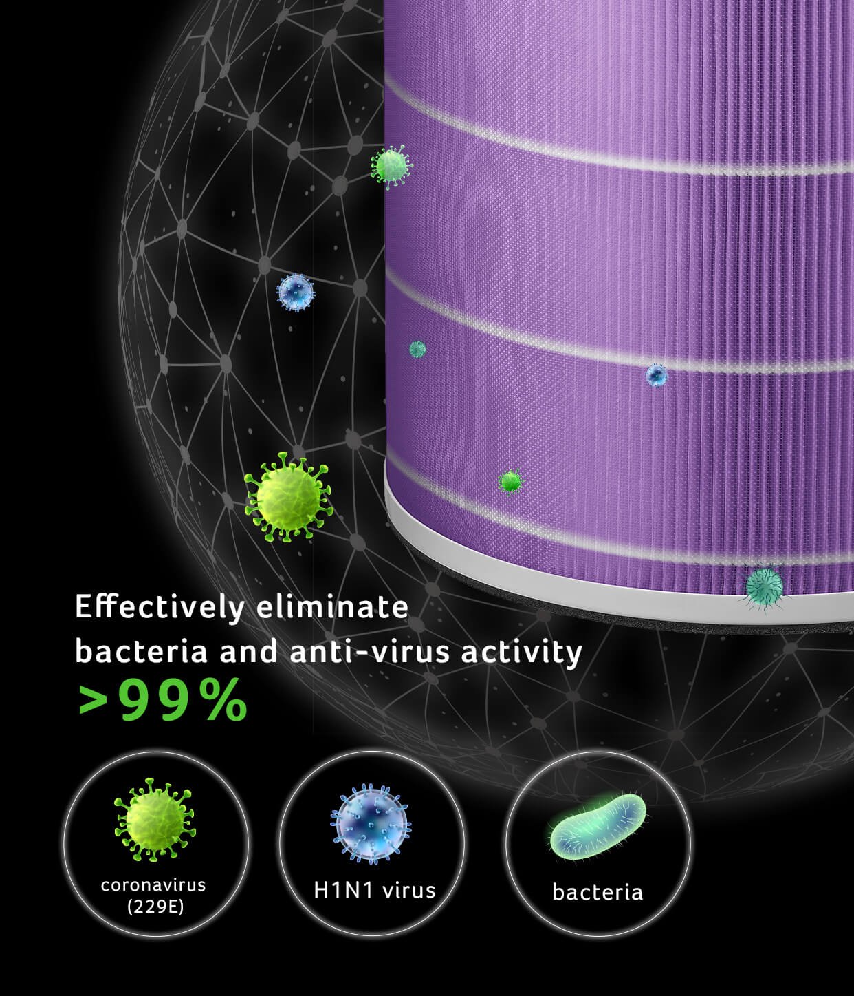Elimina de forma efectiva un 99.99% de bacterias, y en un 99% la actividad del coronavirus (229E) y el virus de la gripe A (H1N1).
