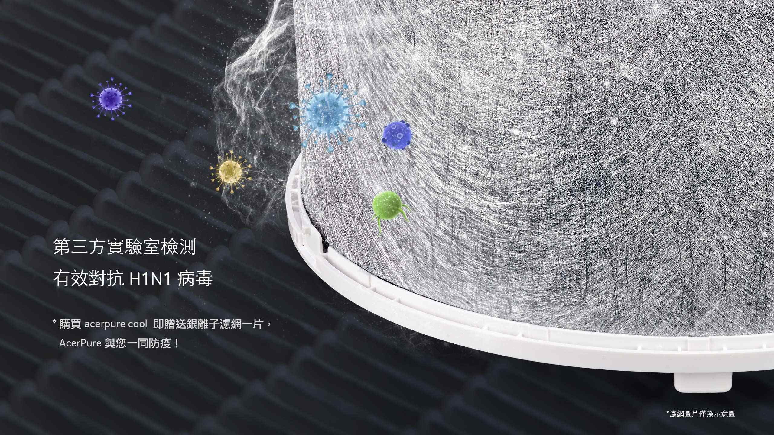 經第三方實驗室檢測,acerpure cool 搭配的銀離子濾網的抗病毒(H1N1)活性高達九成以上3,