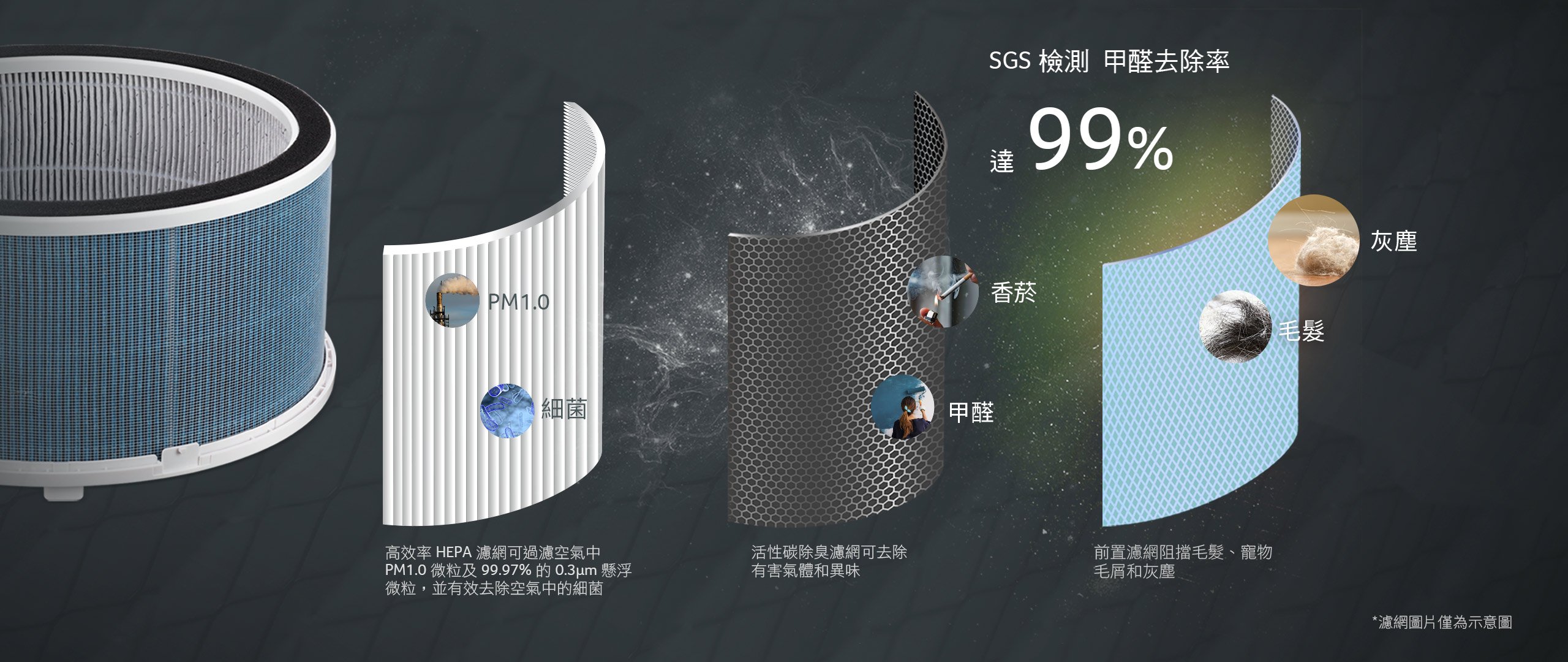 3合1HEPA濾網為您隔絕空氣中的PM1.0及99.97%的懸浮微粒。
