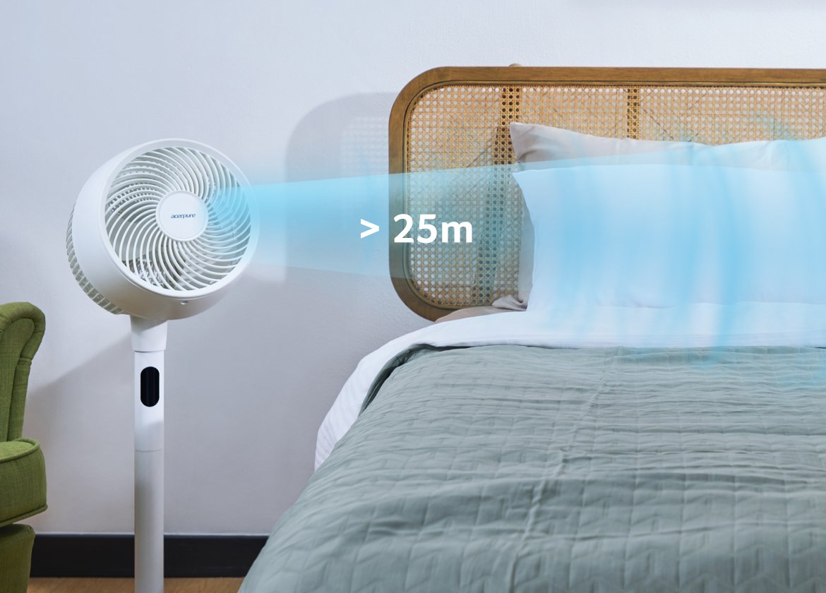 Acerpure Cozy可將氣流送至25公尺遠,在最大適用坪數93坪內,一小時空氣循環可達3次*,讓循環帶來的舒適不斷吹送到居家的各個角落