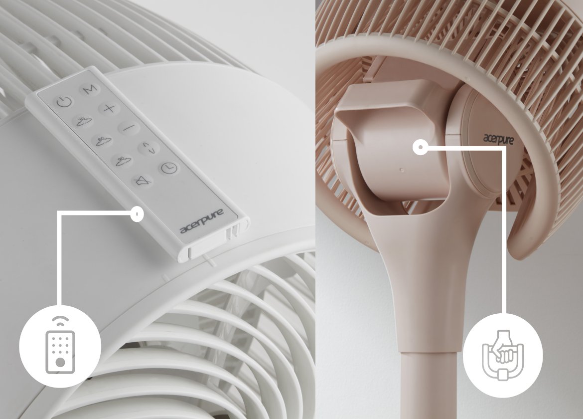 相較一般風扇,Acerpure Cozy採用多方向螺旋擺頭技術,上下90度,左右90度,再加上大傾角渦輪式扇葉,可觸控調節16重風量,讓集中的風循環全室空氣