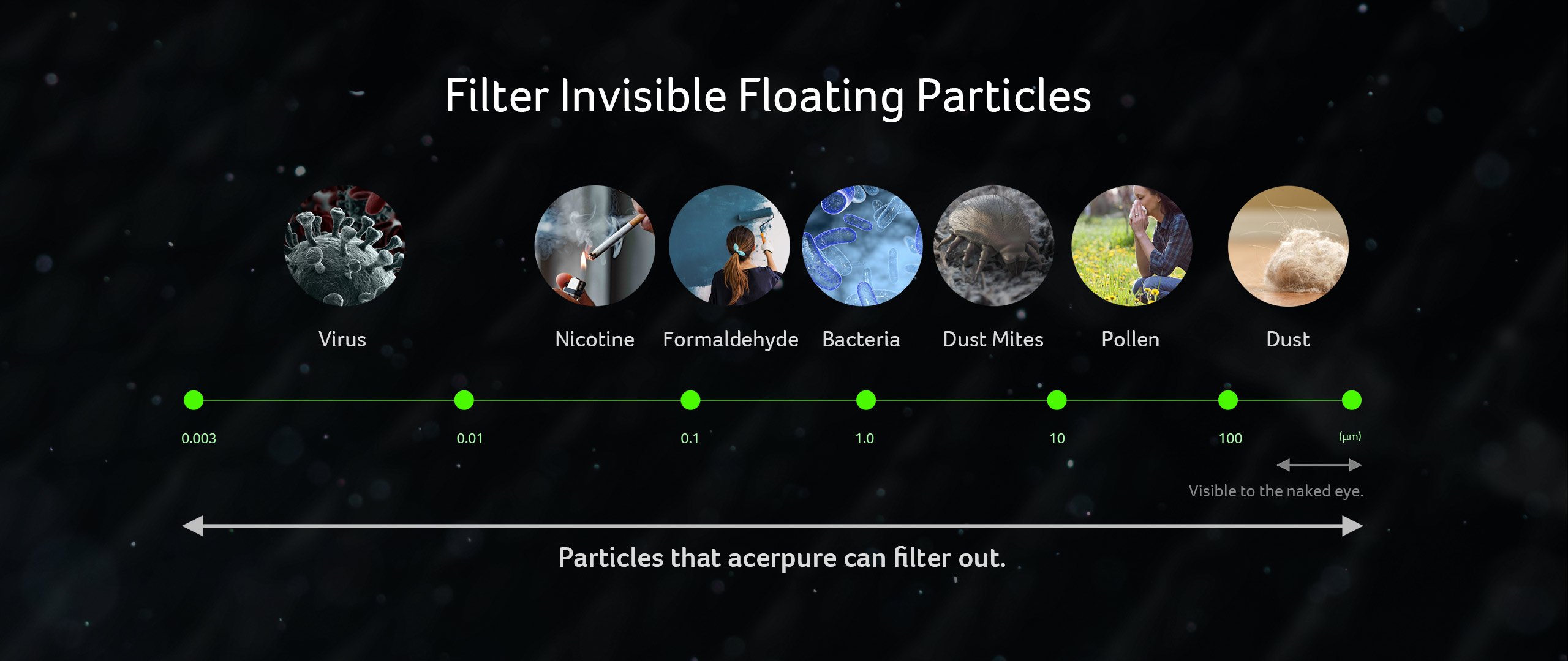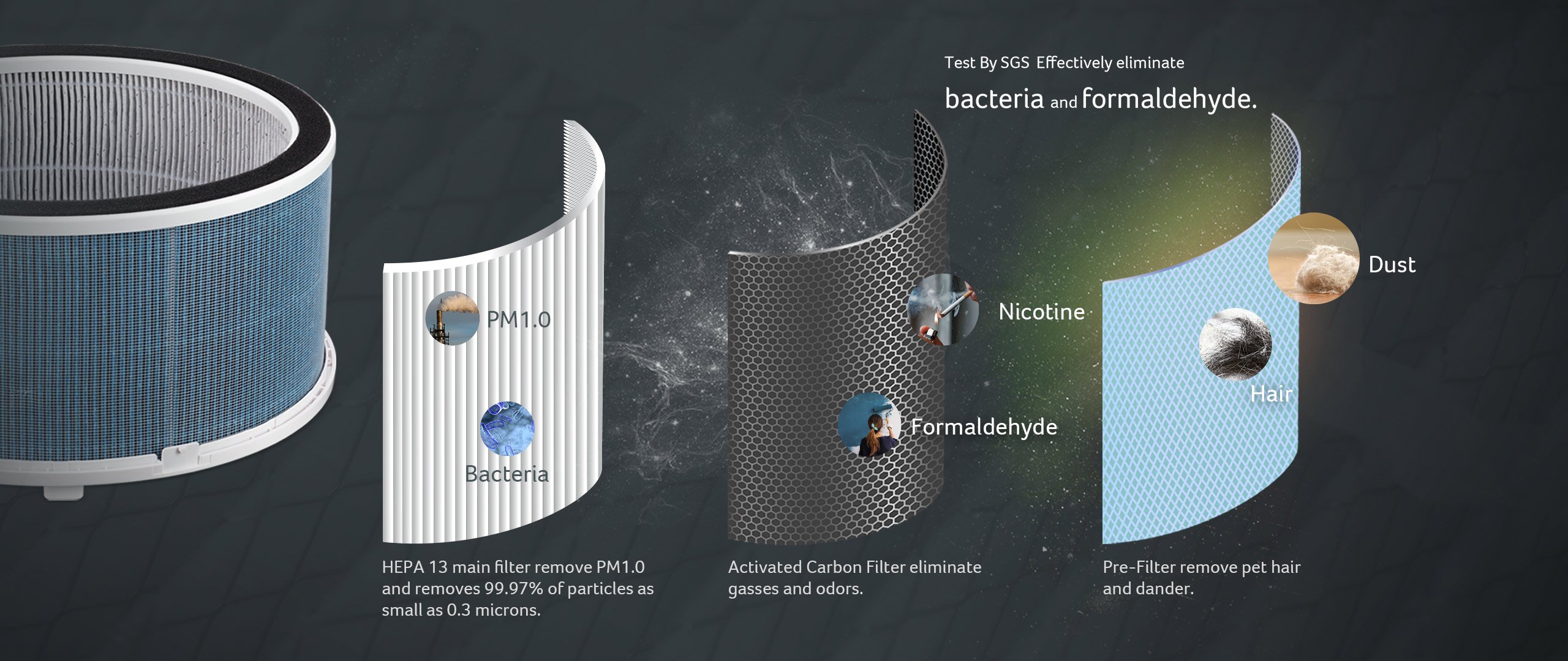 it also removes 99.97% of particles as small as 0.3 microns, such as PM1.0, allergies, bacteria², formaldehyde³ and odors.