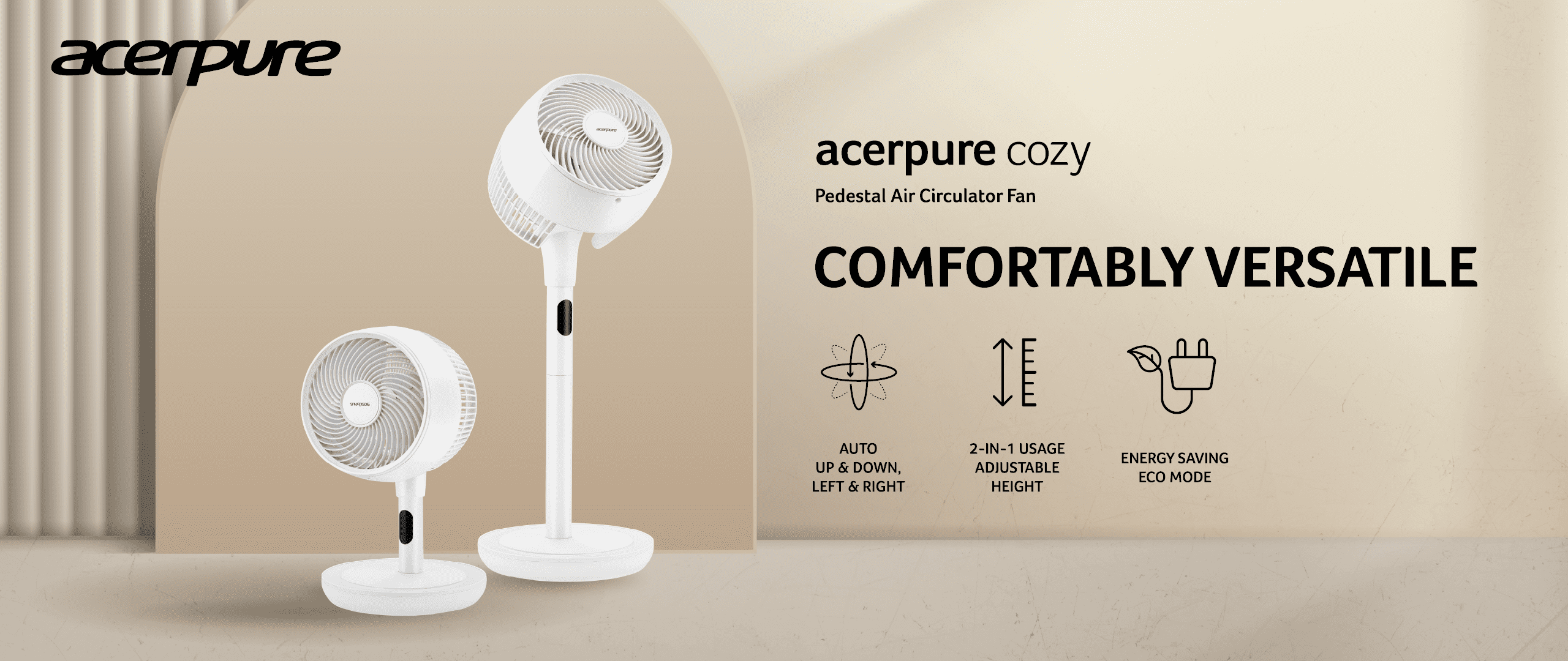 With its multi-directional spiral swing, Acerpure Cozy evenly distributes airflow. It features an up-and-