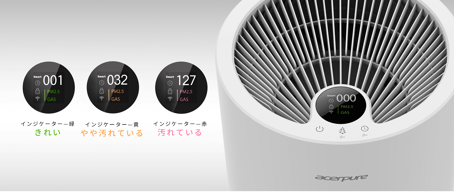 本体背面に配置した2つのセンサーが空気の状態を検知し、リアルタイムで液晶ディスプレイに表示します。空気質(粒子)センサーはPM2.5などを計測し、粒子数(理論値)を白色の数字で表示。ガス(VOC)センサーは、ホルムアルデヒドやタバコの煙などの揮発性有機化合物を計測。「GAS」の文字が緑、黄、赤の3色に変化し、汚れの程度をお知らせします。本体電源をONにして液晶ディスプレイを見るだけで、お部屋の空気の状態をひと目で把握できます。