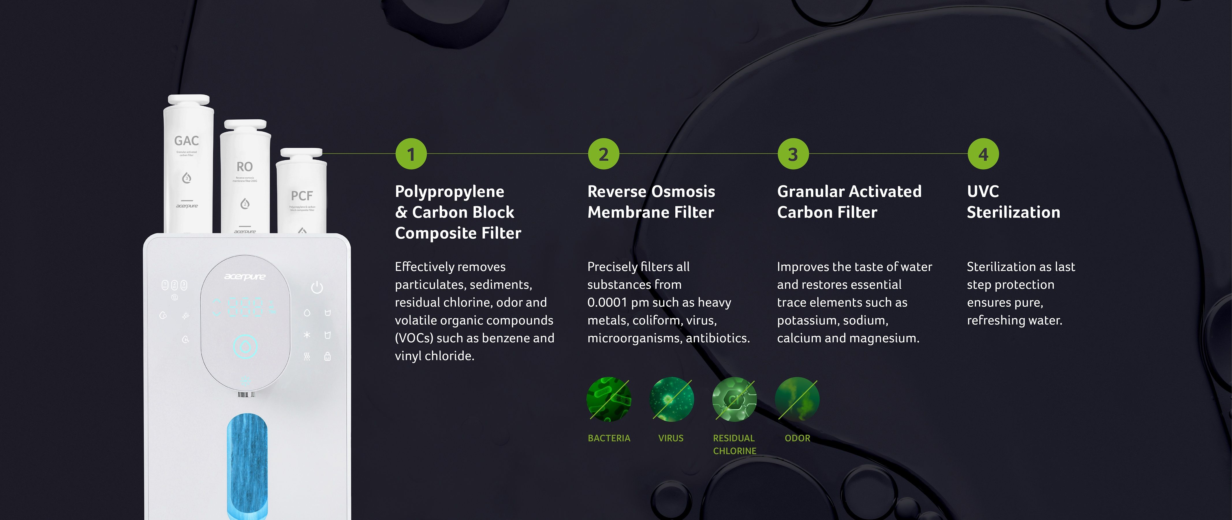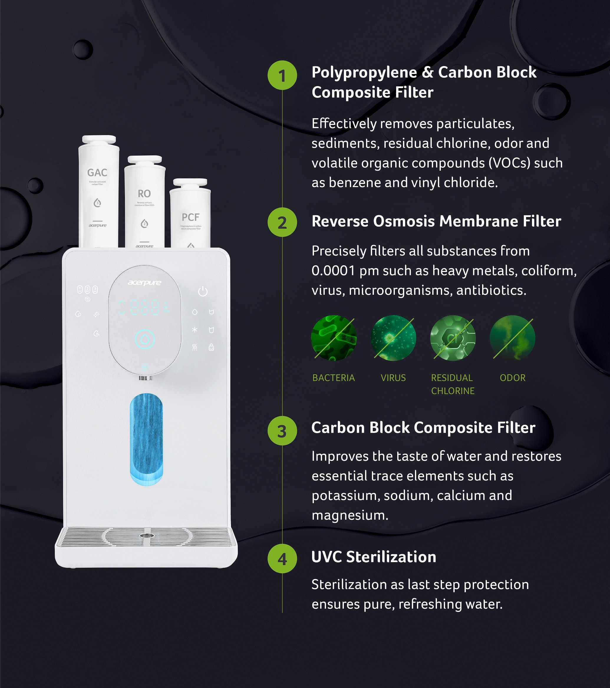 Protect your family with a sophisticated 4-step filtration system that ensures purified water without unwanted substances.