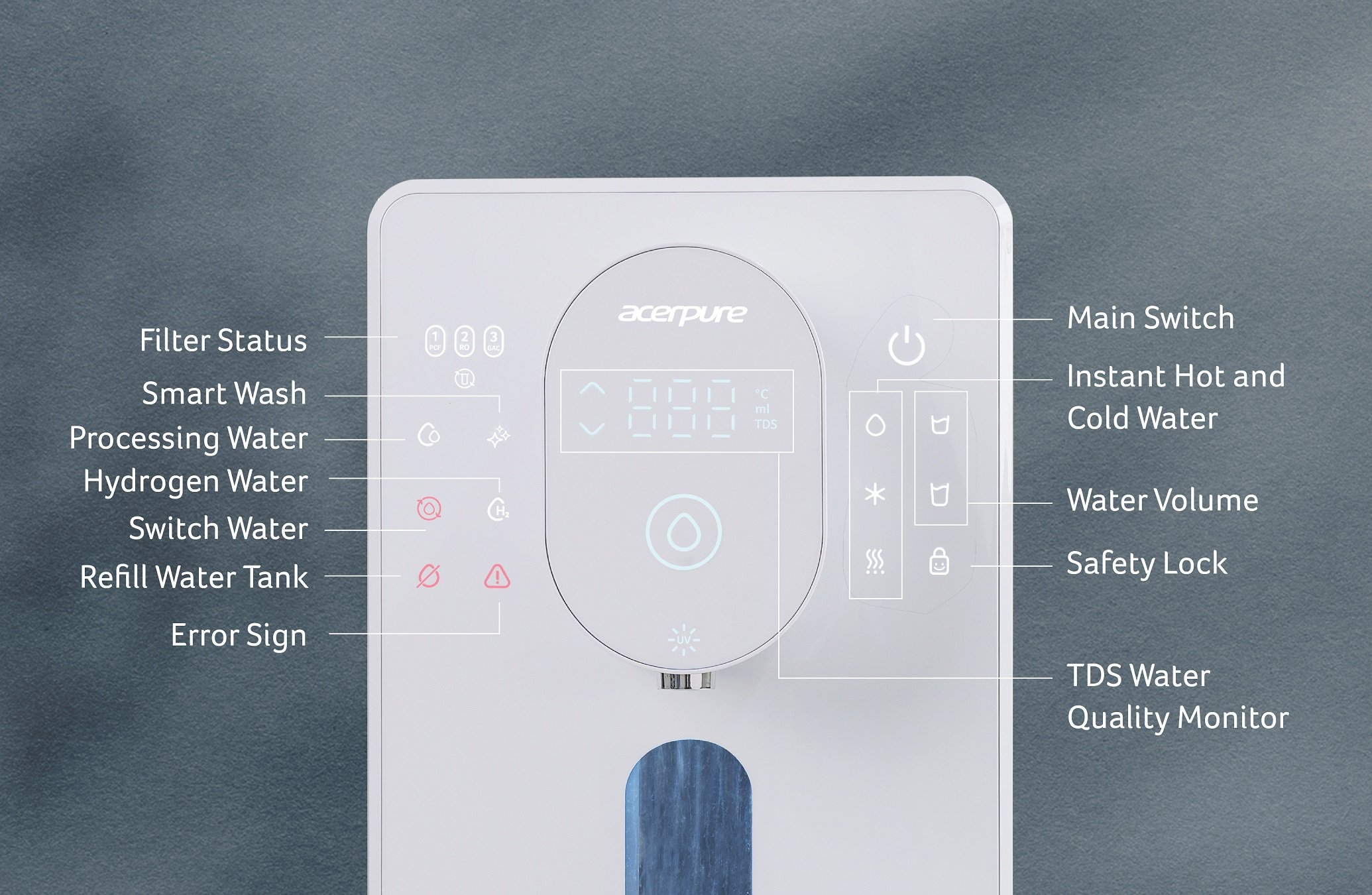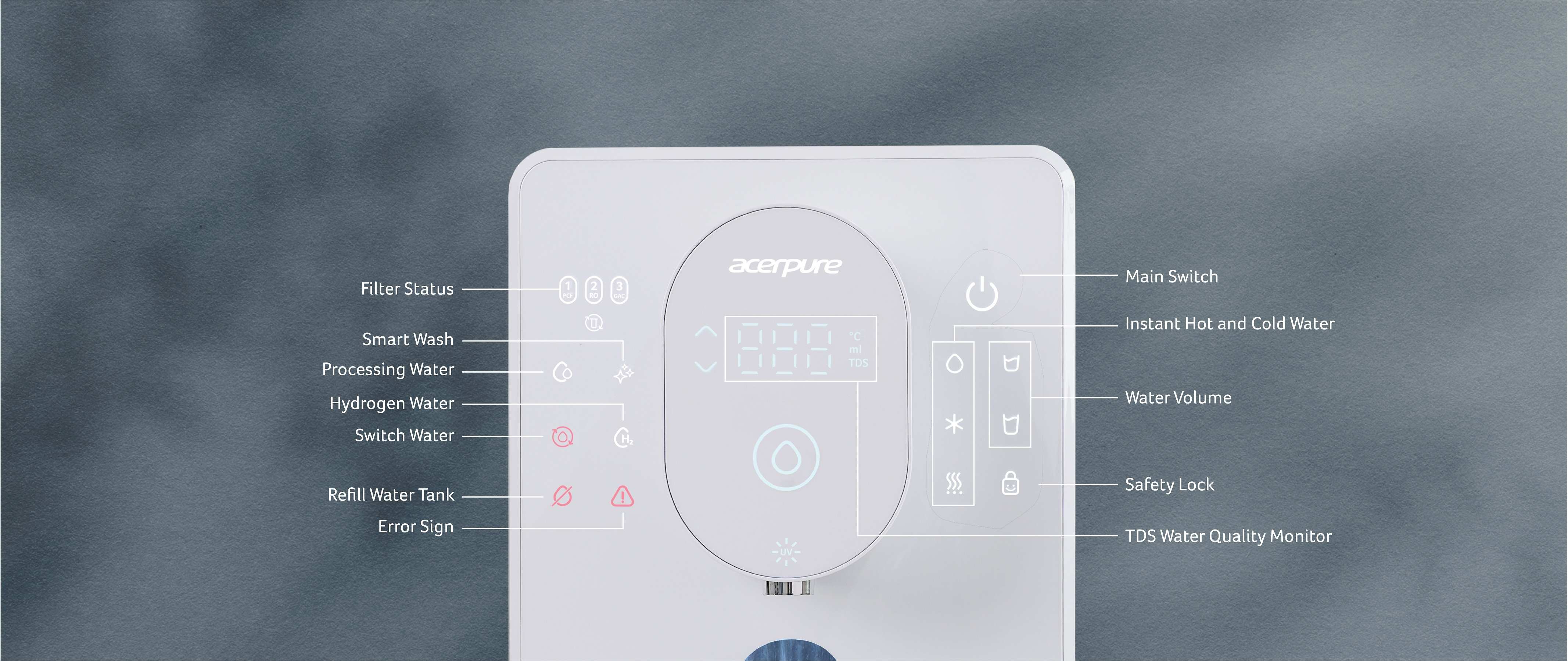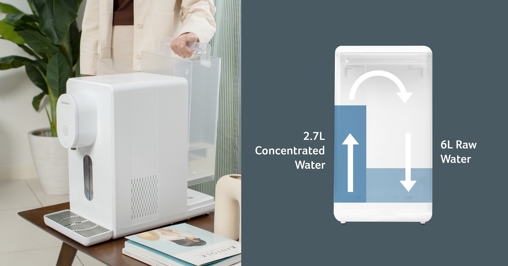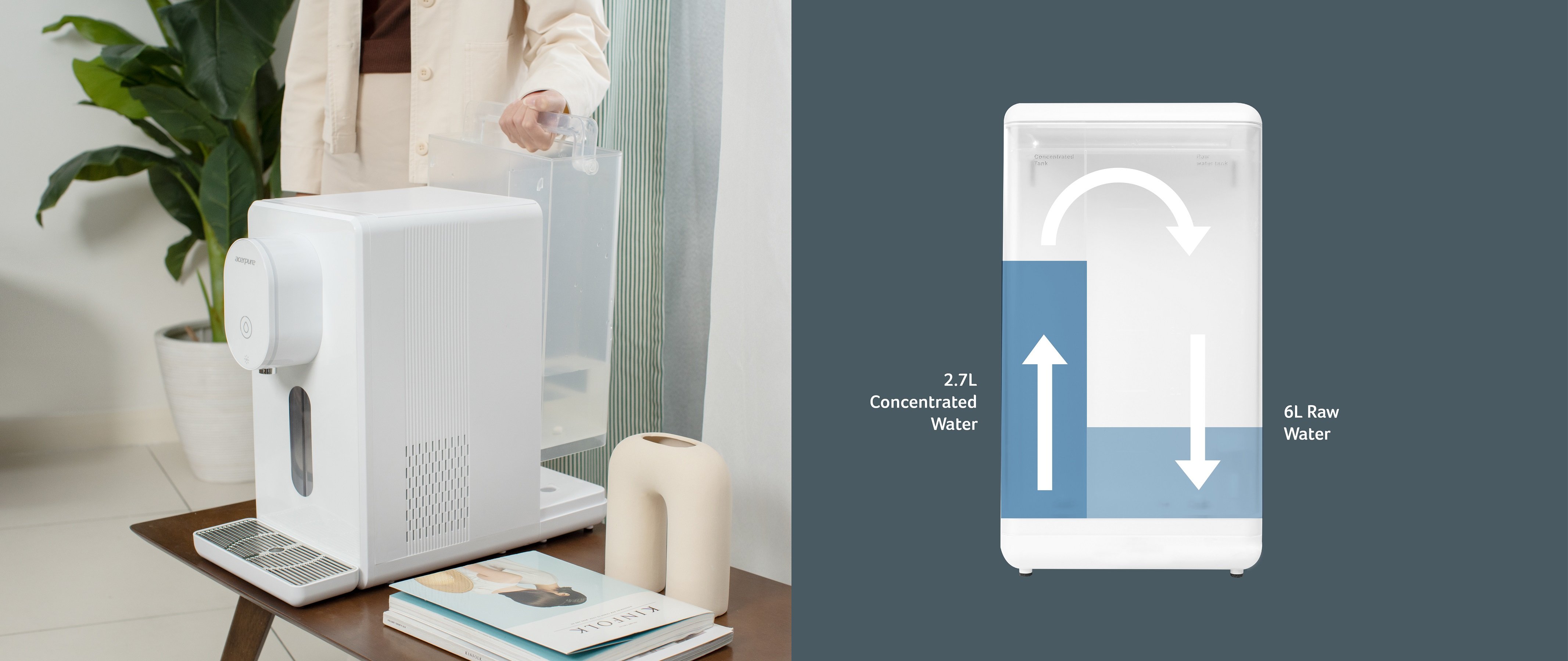 Never run out of purified water with 8.7L water tank and the 2-sided water tank design. Water waste would be decreased by 3 times, making it better for our environment.
