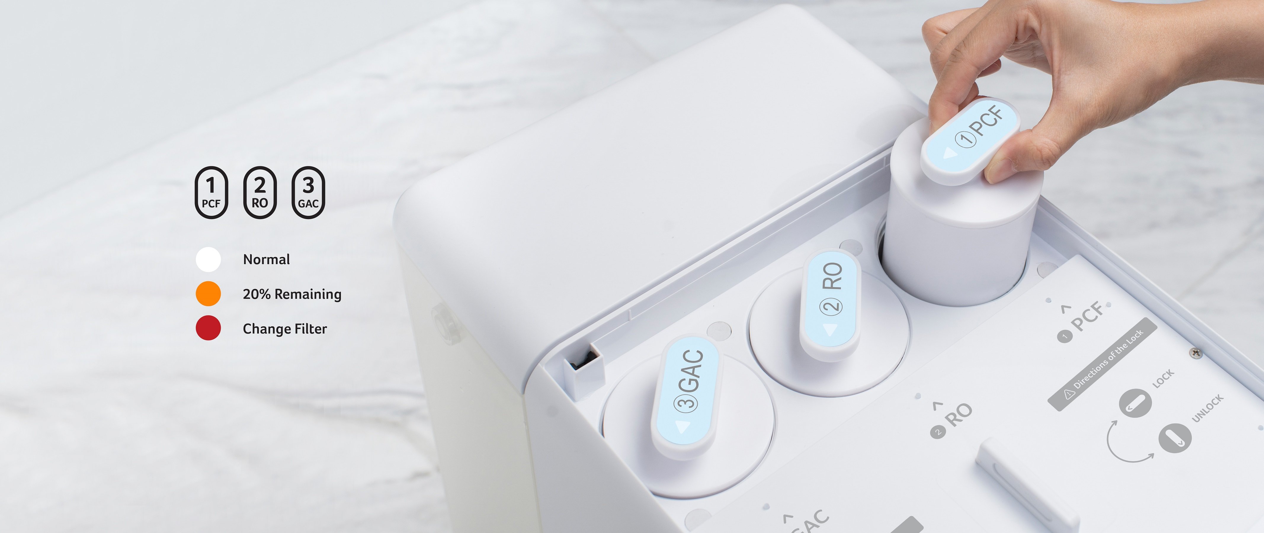 Clearly monitor the filter status via indicators and when alert lights up, user can change the filter easily.