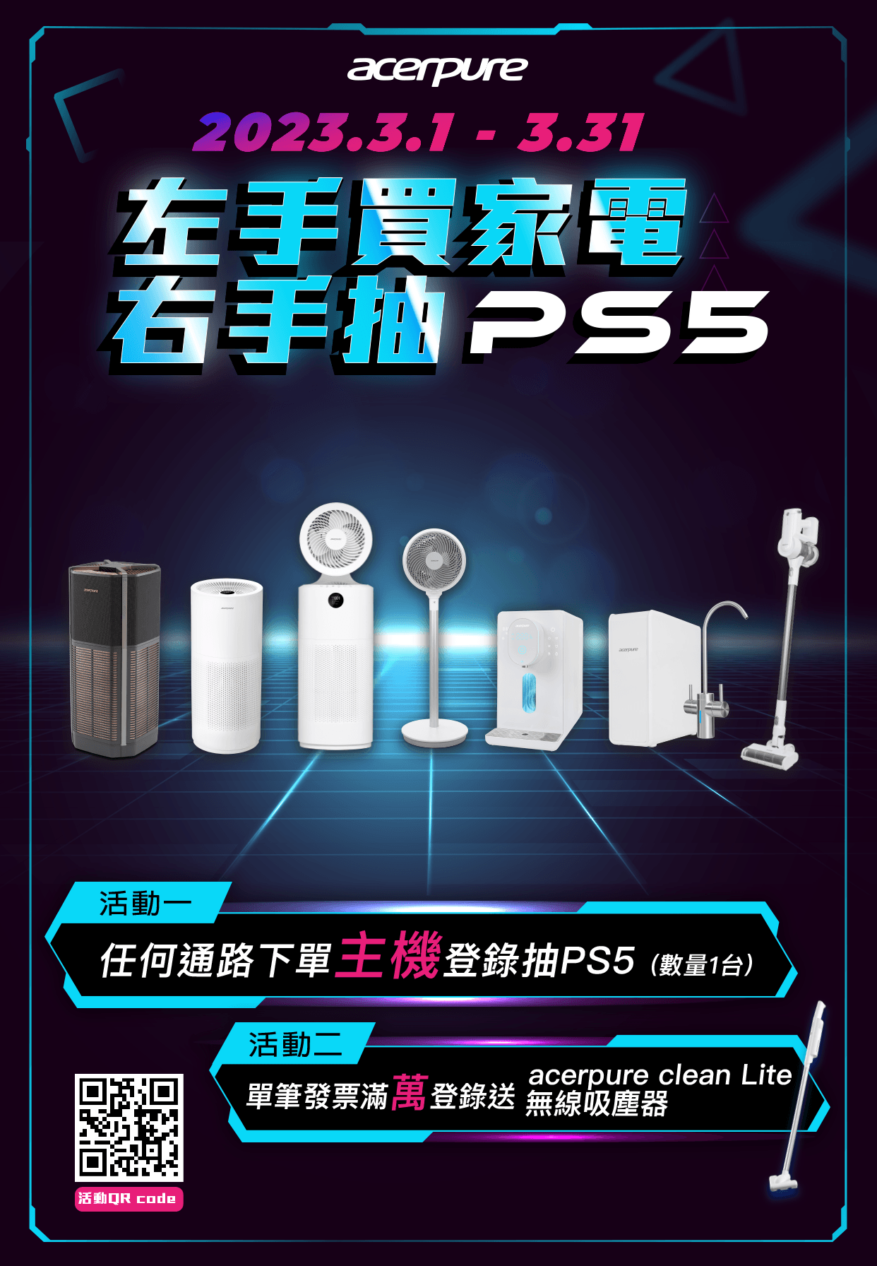 於活動期間 (2023/3/1-2023/3/31)全通路下單主機並官網登錄,就抽PS5玩爽爽,滿萬再送攜帶型無線吸塵器!