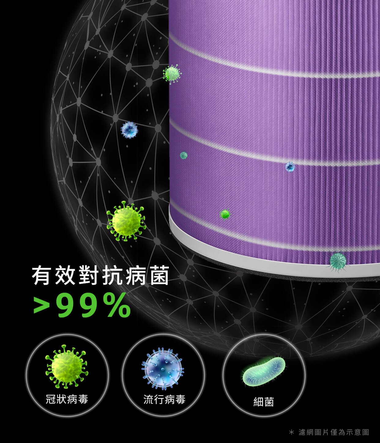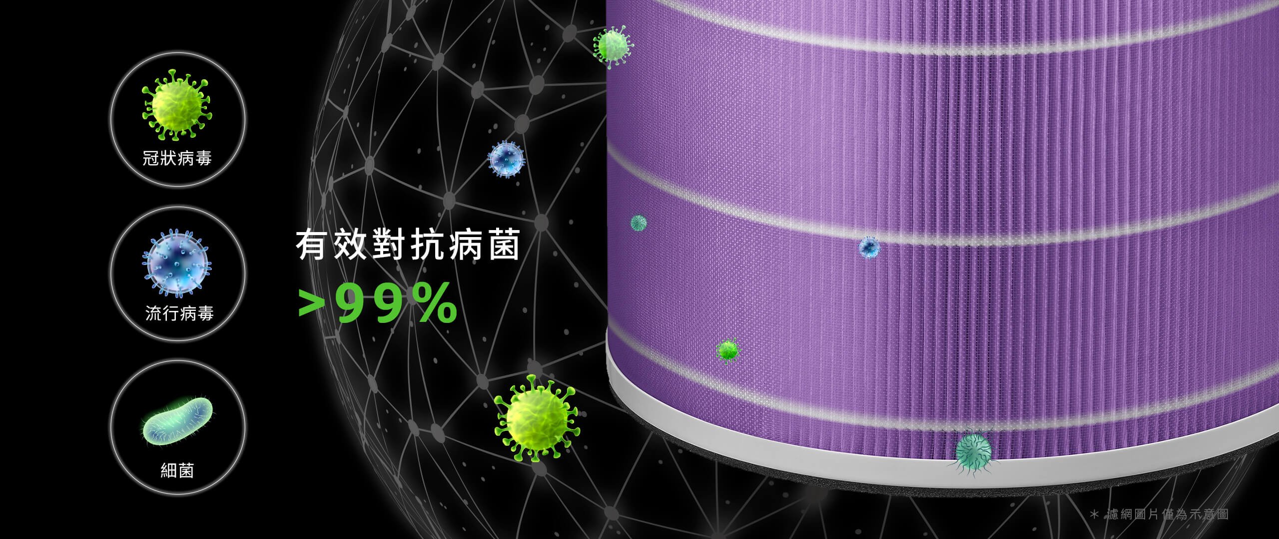 更能對抗大於99%以上的流行病毒與冠狀病毒活性,讓您擁有安全放心的居家環境。