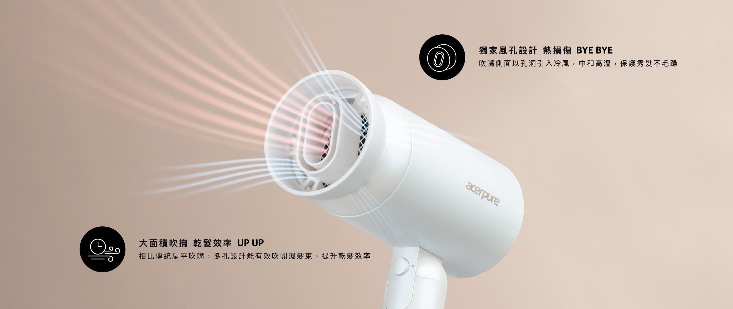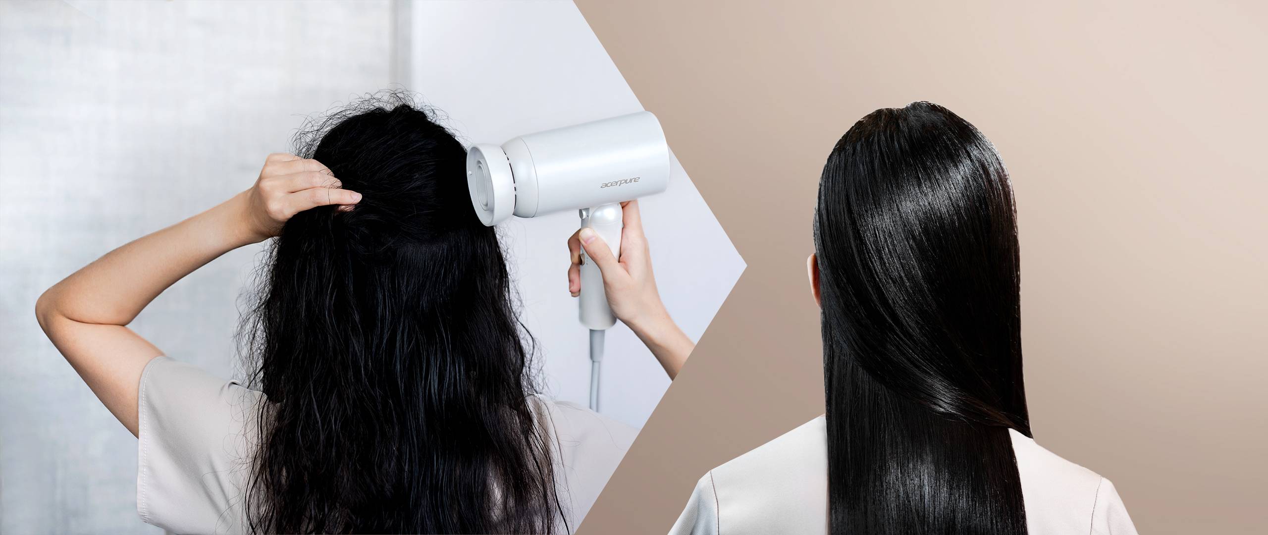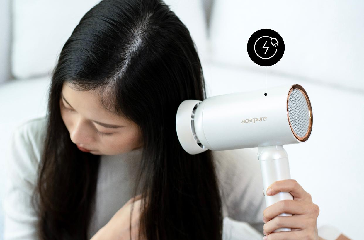 擁有 Acerpure 2200 萬高濃度負離子科技 *,撫平毛躁更顯水潤感,只要吹乾頭髮,即刻擁有滑順亮澤感。