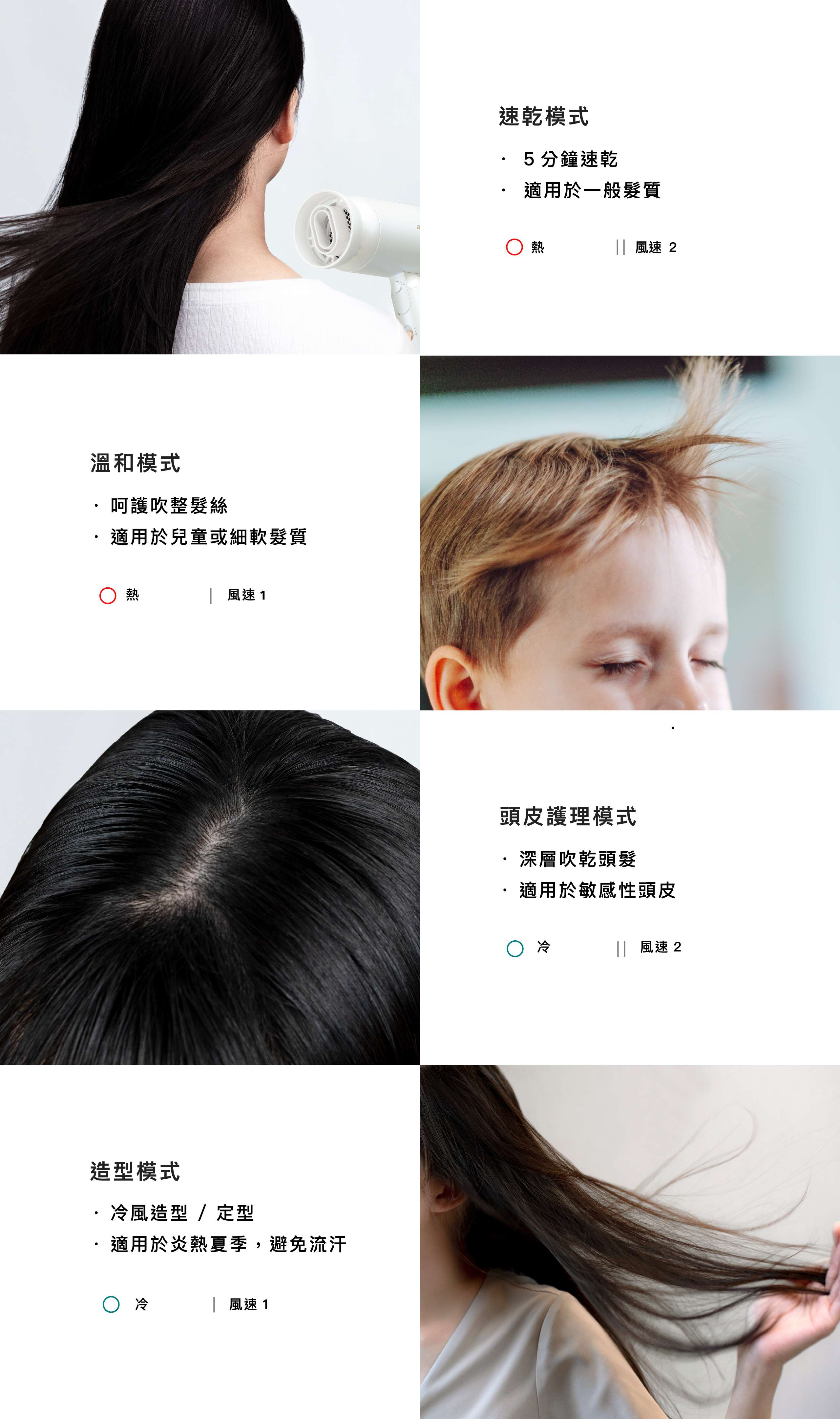 擁有速乾、溫和吹整、冷風造型與頭皮護理四種模式,可自由調節冷熱風及風速,滿足不同時刻的使用需求。
