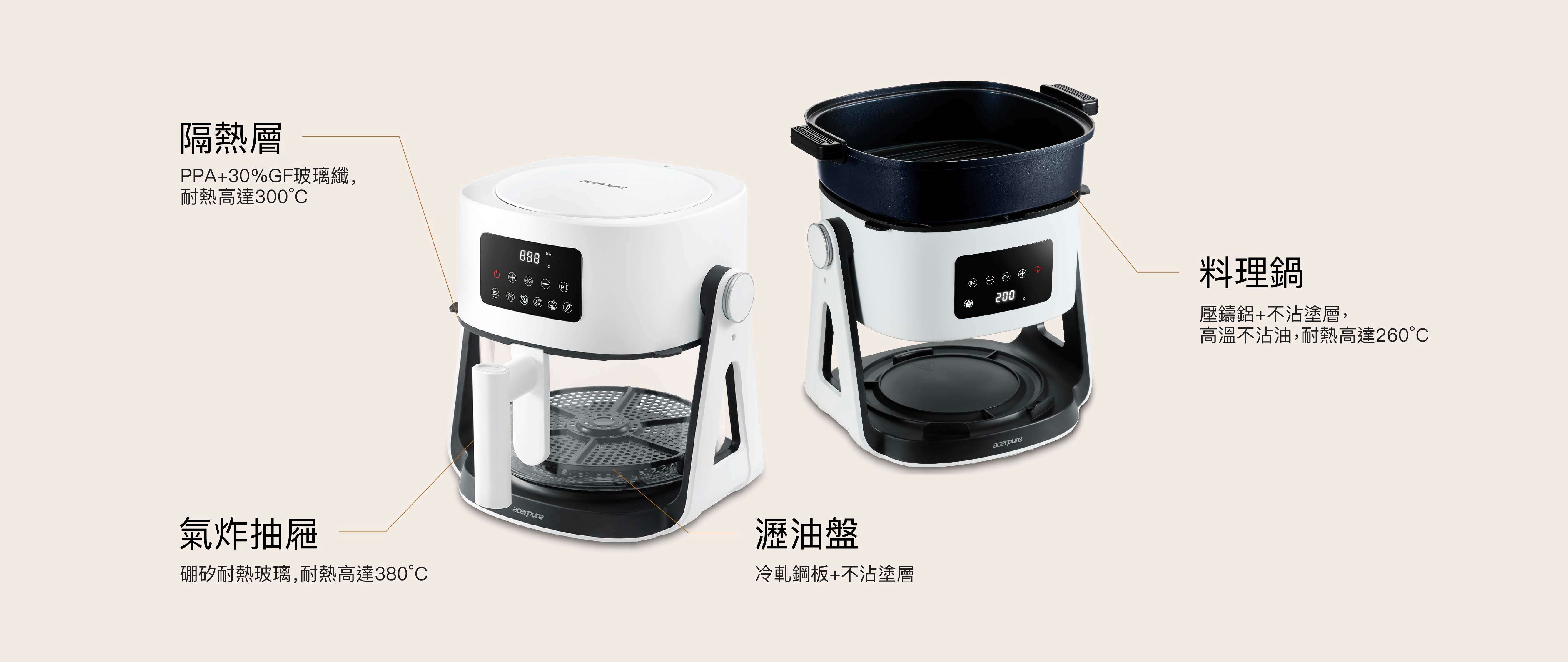 氣炸抽屜:硼矽耐熱玻璃 料理鍋:壓鑄鋁+不沾塗層 |