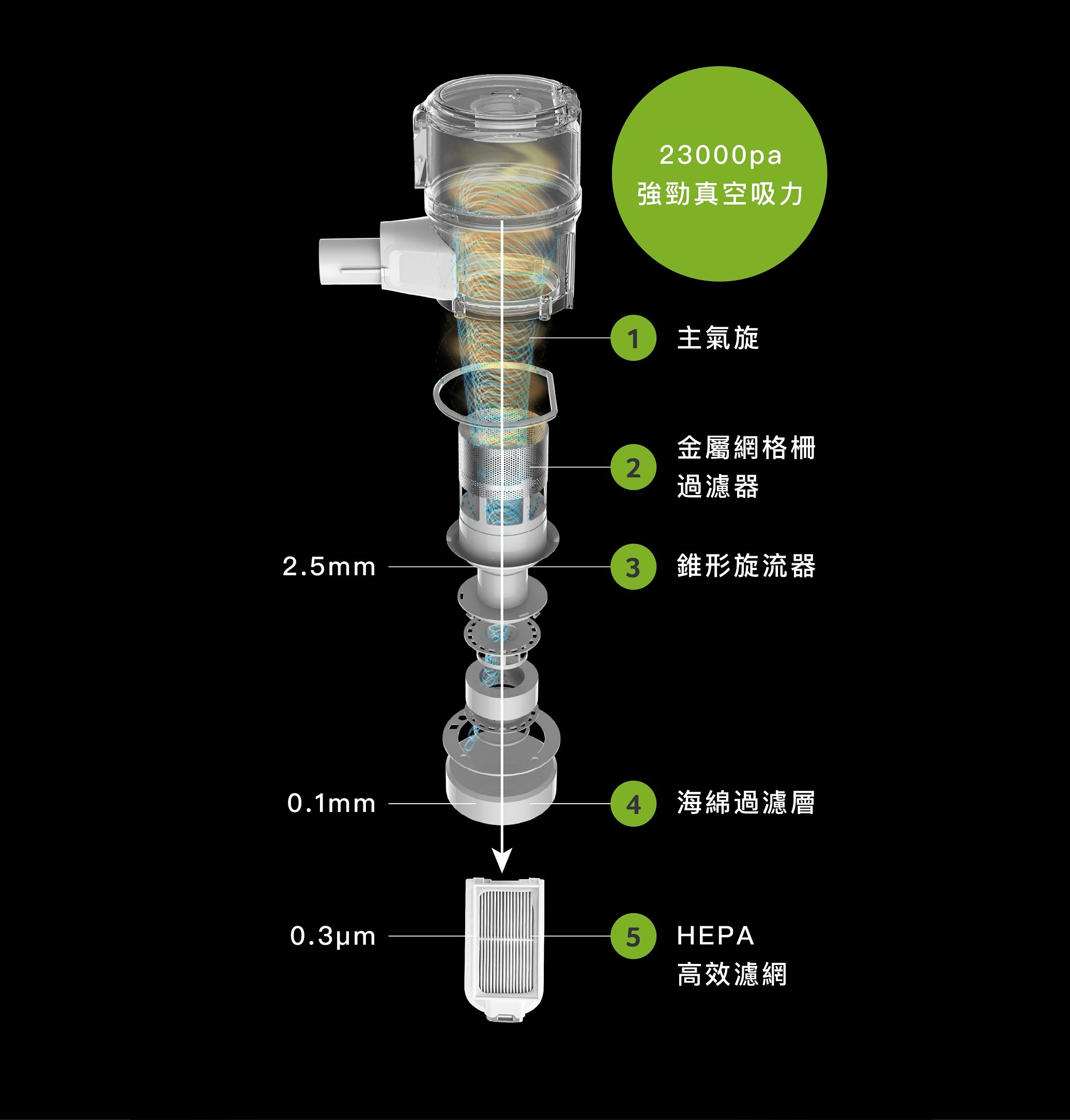 五道重重過濾,可攔截大大小小的汙垢和灰塵,且保持持久吸氣壓力