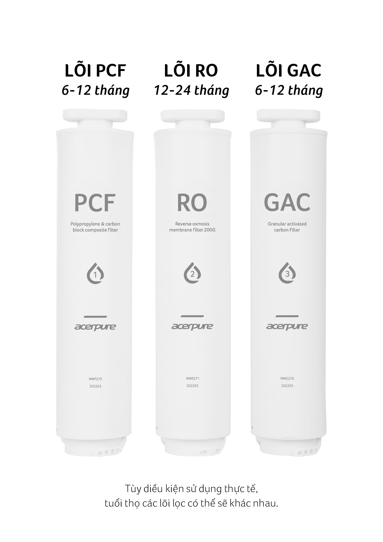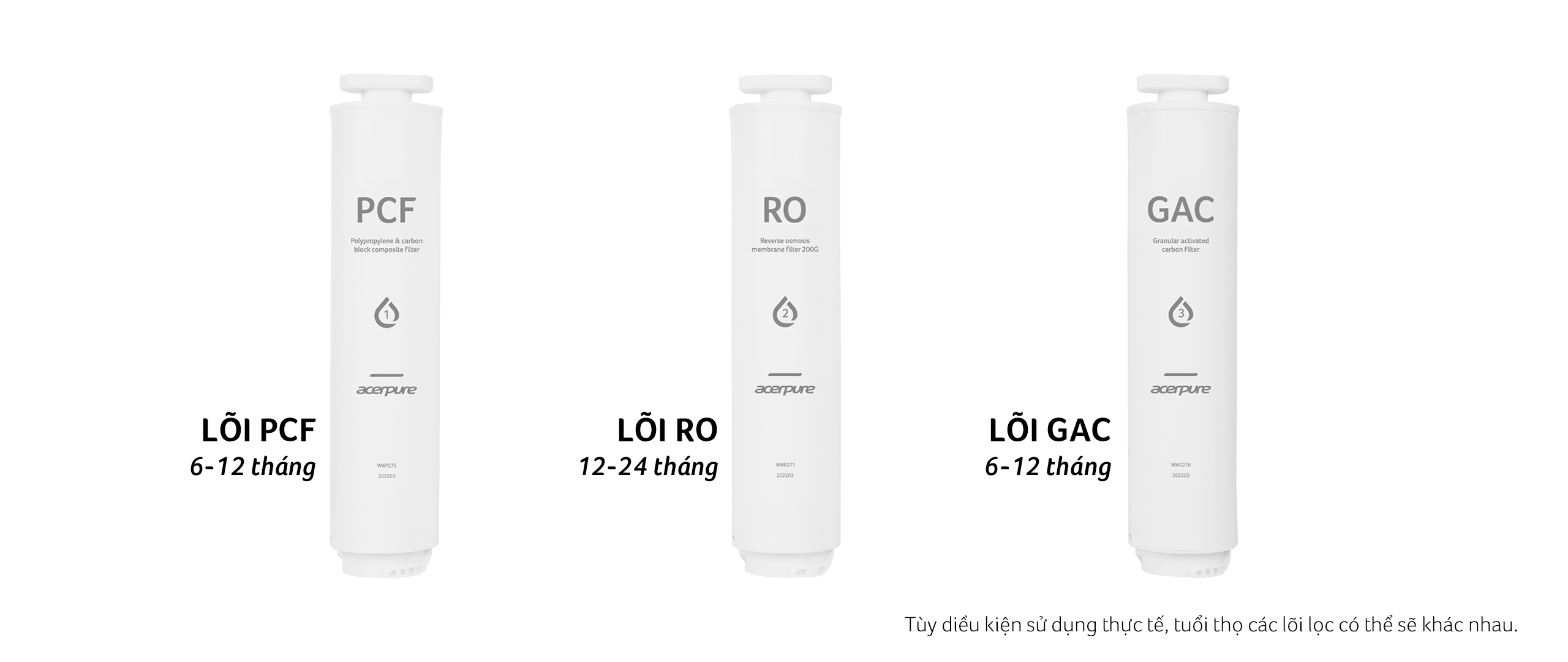 Được chứng nhận bởi SGS Water Quality Test, 3 lõi lọc PCF, RO, GAC có khả năng loại bỏ 99,9% vi khuẩn coliform và 99% các kim loại nặng như thùy ngân, arsenic, cadmium và chì.